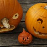 Wir schnitzen zusammen ein gruseliges Kürbisgesicht.